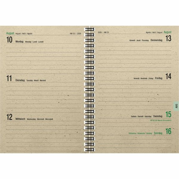 Kalendertyp: Wochenbuch Typ 759Übersichtliches Kalendarium: 1 Woche auf 2 Seiten, mit Wochenzählung für strukturierte PlanungNachhaltig produziert: Kartoneinband aus umweltfreundlichem Graspapier, hergestellt in DeutschlandPraktische Extras: Mit Telefon- und Adressverzeichnis sowie Notizseiten für zusätzliche EintragungenBenutzerfreundlich: Drahtkammbindung für komfortables Umblättern und flaches AufschlagenSprachvielfalt: 4-sprachiges Kalendarium (DE/GB/FR/IT)Format & Ausstattung: 14 × 20 cm, 144 Seiten, handliches Format für Büro, Schule und unterwegs