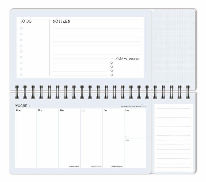 Dieser Wochenplaner mit Kalendarium für den Schreibtisch ist eine perfekte Unterstützung fürs Büro oder Homeoffice. Mit dem Tischkalender behältst du jede Woche mit all deinen Terminen und Deadlines auf einer Seite im Blick. Tolle Extras wie kleine Notizzettel zum Abreißen und ein Geburtstagskalender machen den Schreibtischplaner zu einem Multitalent. Diverse Mitmach-Seiten und ein veredelter Stickerbogen sorgen für gute Laune. Dank einer Jahres- & Monatsvorschau auf einer Seite lässt sich das Jahr 2026 optimal planen.