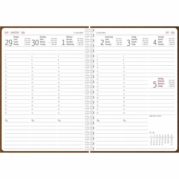 Nachhaltiger Einband: Aus umweltfreundlichem Strukturpapier in frischer NaturfarbePraktisches Format: A5 (ca. 15×21 cm) ideal für unterwegs und ZuhauseÜbersichtliche Wochenplanung: 1 Woche pro Doppelseite, Montag Freitag mit Zeiteinteilung 07 22 Uhr, Platz für kurze NotizenRobuste Ringbindung: Einfaches Auf- und Umklappen der SeitenGut organisiert: Jahresübersichten 2026/2027, Monatsübersichten Januar 2026 August 2027, Tages- & ZinstageszählerZusatzfunktionen: Adress- & Notizseiten, wichtige Telefonvorwahlen, Ferientermine DE/AT/CHInternational nutzbar: 4-sprachiges Kalendarium (DE/FR/IT/GB) mit Feiertagen für DE/AT/CH/FR/ITNachhaltig produziert: FSC-zertifiziert, Druck mit Soja- statt ErdölfarbenDetails: 128 Seiten, Innenteil mit fein gerundeten Ecken
