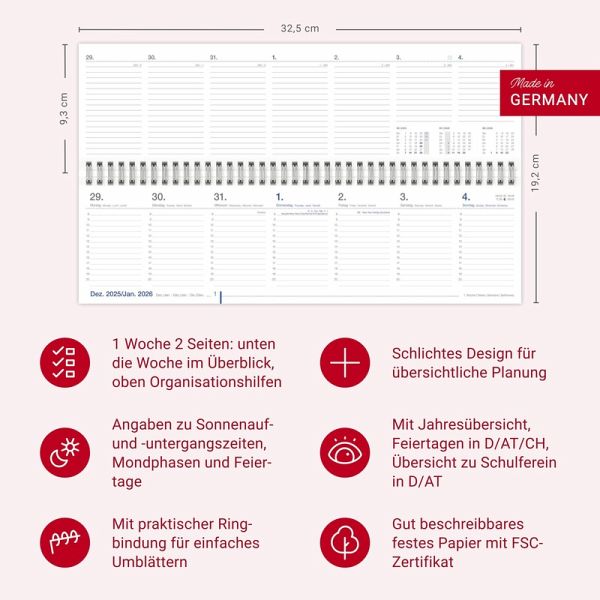 - Das Organisations-Talent, das mit der Zeit geht: Der Tischkalender für Büro und zuhause mit viersprachigem Kalendarium und viel Platz für Notizen- Volle Konzentration auf das Wesentliche: Kalender zum Umklappen im Querformat 32,5 x 9,3 cm mit 2 Seiten pro Woche inkl. Drei-Monatsübersichten- Minimalistisches Design für maximale Terminübersicht: Neutraler Wochenkalender in anthrazit mit Jahresübersicht für 2027, Schulferien und nationalen Feiertagen- So geht Planen praktisch von alleine: Spiral-Kalender 2026 für alle wichtigen Meetings, Verabredungen und Geburtstage der Woche- Für alle, die das Termin-Chaos schlicht und einfach im Griff behalten wollen: Die Schreibtisch-Kalender von Heye aus dem Athesia KalenderverlagSprachen: Deutsch, Englisch, Italienisch