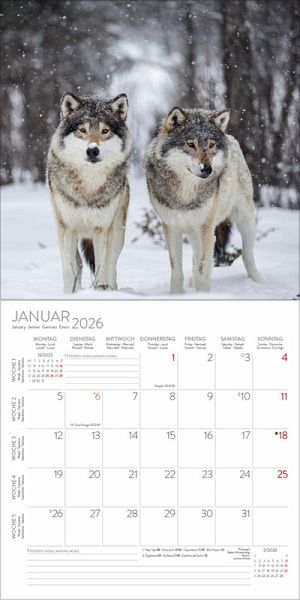 Wandkalender im Format: 30 x 30 cm; Offenes Format: 30 x 60 cm; umweltfreundliches FSC PapierJede Kalenderseite mit großem Bild und viel Platz im Kalendarium für Notizen und TermineMehrsprachiges Kalendarium: DE/GB/FR/IT/ES mit Feiertagen für D/A/CH/GB/FR/IT/ESRegionale Ferienzeiten für DE/A/CHMonatsübersicht für den jeweiligen Vor- und Nachmonat; Jahresübersicht