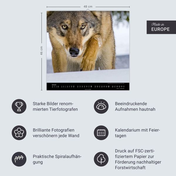 - Scheue Wildtiere in faszinierenden Bildern: der Wolf im Jahres-Wandkalender 2026- Ein seltener Anblick im heimischen Wald: Wolfaufnahmen von renommierten Fotografenpaar Jean-Louis Klein und Marie-Luce Hubert- Die geheimnisvollen Rudeltiere, ganz nahe und in ihrer natürlichen Umgebung: Fotokalender in brillanter Farbqualität- Wildlife für die Wand: Monatskalender im Blickfang-Format 48 x 46 cm- Tierfotografie vom Feinsten: die Bildkalender-Bestseller von Weingarten im Athesia Kalenderverlag