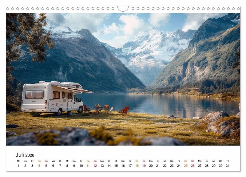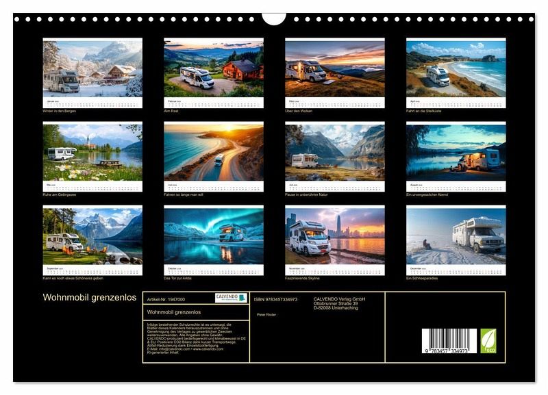 Bei diesem Kalender denkt man nur an eines: "Ab in den Urlaub!" Begeben Sie sich auf eine Wohnmobil- Reise durch 12 Monate voller atemberaubender Naturschönheit. Sie werden in herrliche Landschaften entführt. Ob Sonnenuntergänge am Meer, Panoramablicke auf die Berge oder wunderbare Schneelandschaften, hier wird das Fernweh lebendig. Der Fotokünstler hat dazu grandiose KI-Bilder gestaltet und zusammengestellt. Perfekt für Naturliebhaber, Träumer, Reisende und Wohnmobil-Enthusiasten.