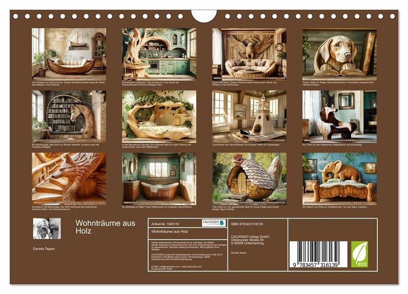 Dieser Kalender ist nicht nur ein praktischer Begleiter durch das Jahr, sondern auch eine Hommage an die Kreativität und das Können der Holzhandwerker. Entworfen von einer KI, präsentiert er die charmantesten und ausgefallensten Möbelstücke, die Sie je gesehen haben - und vielleicht sogar einige, die Sie inspirieren, selbst zum Werkzeug zu greifen und Ihr eigenes Meisterwerk zu schaffen! Lassen Sie sich inspirieren von der Harmonie zwischen Natur, Technologie und Funktionalität und bringen Sie mit diesem Kalender ein Stück belebende Kunst in Ihr Zuhause oder Büro. Exklusivität hat noch nie so viel Spaß gemacht!