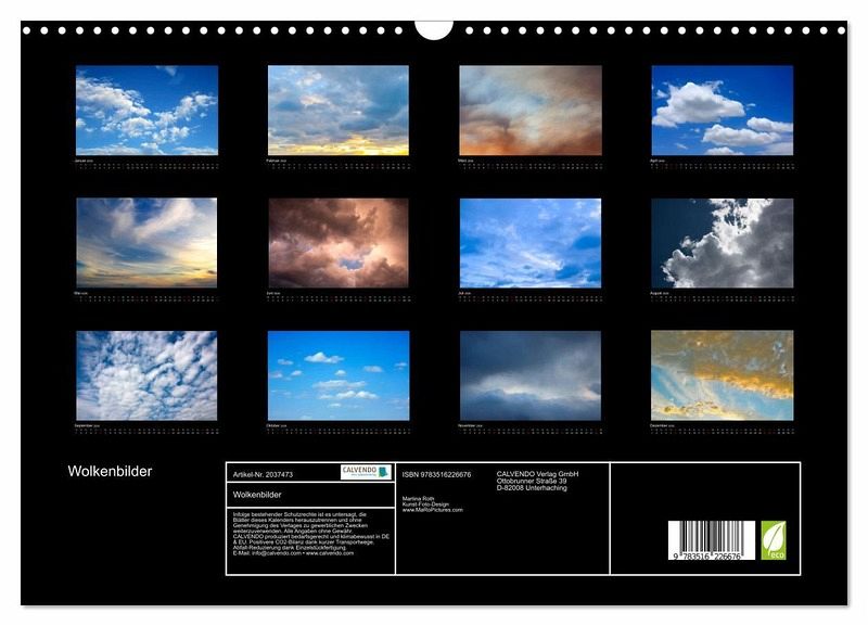 QUALITÄT - Hochwertiger Fotokalender mit 12 wunderschönen Motiven auf lichtbeständigem Bilderdruckpapier, robuste Spiralbindung mit Aufhängebügel.NACHHALTIG - deutliche Abfallreduzierung durch bedarfsgerechte Einzelstückfertigung, umweltfreundliches FSC-zertifiziertes Papier, Produktion in Deutschland, klimabewusste Logistik.PERFEKTES GESCHENK - Kalender für Freunde und Familie, für Kinder und Erwachsene, jung und alt, zu Weihnachten, Geburtstag oder zwischendurch.VIELFALT - Bildkalender in verschiedenen Formaten, z.B. DIN A5, DIN A4, DIN A3 sowie DIN A2. Ob Naturmotiv, Gemälde oder Fotos, ideal für ein persönliches Wohlfühlambiente.Beeindruckende Wolkenbilder von Autor(in): Martina Roth