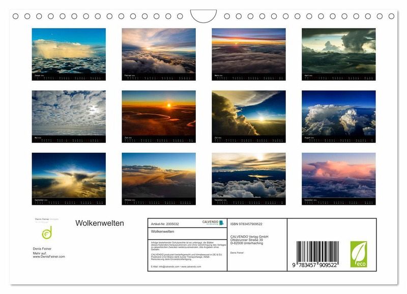QUALITÄT - Hochwertiger Fotokalender mit 12 wunderschönen Motiven auf lichtbeständigem Bilderdruckpapier, robuste Spiralbindung mit Aufhängebügel.NACHHALTIG - deutliche Abfallreduzierung durch bedarfsgerechte Einzelstückfertigung, umweltfreundliches FSC-zertifiziertes Papier, Produktion in Deutschland, klimabewusste Logistik.PERFEKTES GESCHENK - Kalender für Freunde und Familie, für Kinder und Erwachsene, jung und alt, zu Weihnachten, Geburtstag oder zwischendurch.VIELFALT - Bildkalender in verschiedenen Formaten, z.B. DIN A5, DIN A4, DIN A3 sowie DIN A2. Ob Naturmotiv, Gemälde oder Fotos, ideal für ein persönliches Wohlfühlambiente.Wolkenstimmungen aus der Vogelperspektive von Autor(in): Denis Feiner