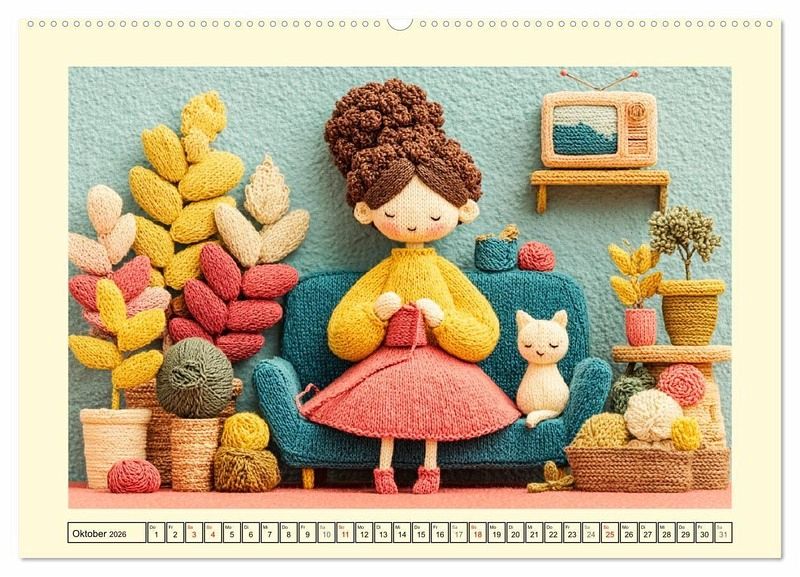 Dieser Kalender entführt in eine liebevoll gestrickte Parallelwelt, in der alles aus weicher Wolle und bunten Garnen besteht. Von den Menschen über ihre Kleidung bis hin zu Möbeln, Pflanzen und Tieren - alles scheint mit Herz und Hand erschaffen. Die Bilder wurden mit der Hilfe von KI erstellt und erzählen kleine, heitere Geschichten über Kreativität und Geborgenheit. Ein Kalender, der Monat für Monat ein Lächeln schenkt und die Wärme des Handwerks spürbar macht.