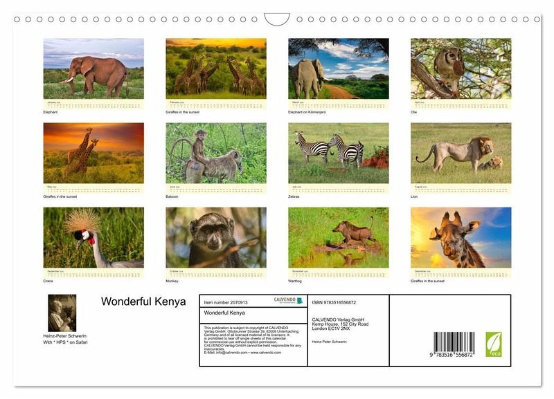 QUALITY - High-quality photo calendar with 12 beautiful images on light-resistant paper, robust spiral binding with hanger.SUSTAINABLE - Significant waste reduction due to print-on-demand production, environmentally friendly FSC-certified paper, produced in the UK, climate-conscious logistical processes.PERFECT GIFT - calendars for friends and family, for children, all ages and all occasions, from Christmas to birthdays and everything in between.LOTS OF CHOICE - Wall calendars in different sizes (DIN A4 and DIN A3), for any topic and personal taste, featuring photography, painting and illustrations.A safari in Kenya is an experience that you will never forget., author: Mit HPS auf Reisen