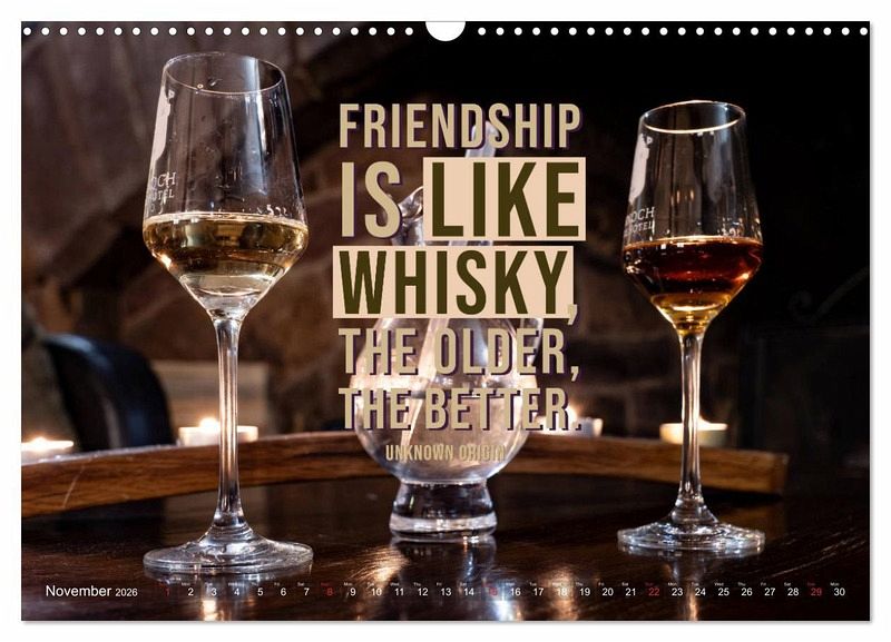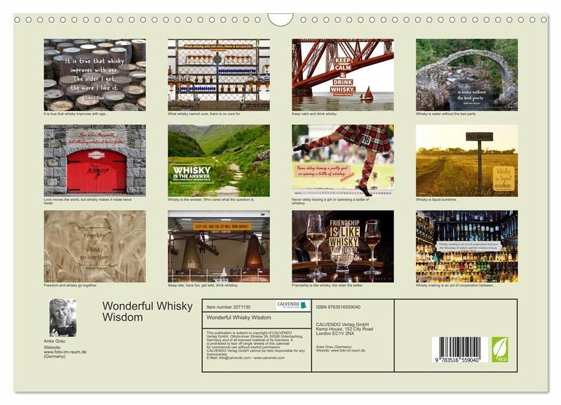 QUALITY - High-quality photo calendar with 12 beautiful images on light-resistant paper, robust spiral binding with hanger.SUSTAINABLE - Significant waste reduction due to print-on-demand production, environmentally friendly FSC-certified paper, produced in the UK, climate-conscious logistical processes.PERFECT GIFT - calendars for friends and family, for children, all ages and all occasions, from Christmas to birthdays and everything in between.LOTS OF CHOICE - Wall calendars in different sizes (DIN A4 and DIN A3), for any topic and personal taste, featuring photography, painting and illustrations.Travel around Scotland with wise whisky sayings, author: Anke Grau