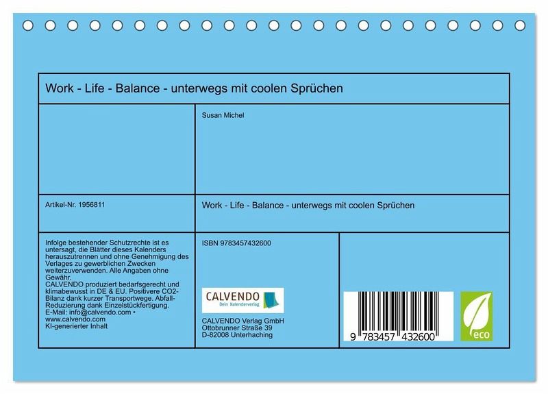 QUALITÄT - Hochwertiger Fotokalender mit 12 wunderschönen Motiven auf lichtbeständigem Bilderdruckpapier, robuste Spiralbindung.NACHHALTIG - deutliche Abfallreduzierung durch bedarfsgerechte Einzelstückfertigung, umweltfreundliches FSC-zertifiziertes Papier, Produktion in Deutschland, klimabewusste Logistik.PERFEKTES GESCHENK - Kalender für Freunde und Familie, für Kinder und Erwachsene, jung und alt, zu Weihnachten, Geburtstag oder zwischendurch.VIELFALT - Bildkalender in verschiedenen Formaten, z.B. DIN A5, DIN A4, DIN A3 sowie DIN A2. Ob Naturmotiv, Gemälde oder Fotos, ideal für ein persönlichesWohlfühlambiente.Arbeit ist wichtig, aber vergiss nicht zu leben! von Autor(in): Susan Michel