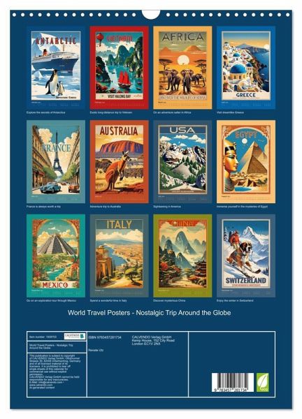 QUALITY - High-quality photo calendar with 12 beautiful images on light-resistant paper, robust spiral binding with hanger.SUSTAINABLE - Significant waste reduction due to print-on-demand production, environmentally friendly FSC-certified paper, produced in the UK, climate-conscious logistical processes.PERFECT GIFT - calendars for friends and family, for children, all ages and all occasions, from Christmas to birthdays and everything in between.LOTS OF CHOICE - Wall calendars in different sizes (DIN A4 and DIN A3), for any topic and personal taste, featuring photography, painting and illustrations.Artful reinterpretations of historical travel posters in vintage style, author: Renate Bleicher