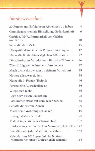 Dank motivierender Erfolgsstorys, Eins-a-Tricks sowie wundervoller Tipps, wie du deinen Alltag sinnlich genießen und dabei die Pfunde schmelzen lassen kannst, richtest du dein Bewusstsein auf Vitalität und Schlanksein. Die hilfreichen Gedanken und Affirmationen dieses Kalenders schenken dir den ersehnten behutsamen Rückenwind beim Erreichen deiner Traumfigur. Tag für Tag tragen sie dich der vollkommenen physischen und geistigen Fitness entgegen.