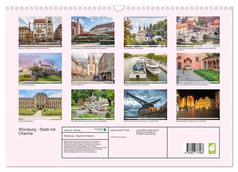 QUALITÄT - Hochwertiger Fotokalender mit 12 wunderschönen Motiven auf lichtbeständigem Bilderdruckpapier, robuste Spiralbindung mit Aufhängebügel.NACHHALTIG - deutliche Abfallreduzierung durch bedarfsgerechte Einzelstückfertigung, umweltfreundliches FSC-zertifiziertes Papier, Produktion in Deutschland, klimabewusste Logistik.PERFEKTES GESCHENK - Kalender für Freunde und Familie, für Kinder und Erwachsene, jung und alt, zu Weihnachten, Geburtstag oder zwischendurch.VIELFALT - Bildkalender in verschiedenen Formaten, z.B. DIN A5, DIN A4, DIN A3 sowie DIN A2. Ob Naturmotiv, Gemälde oder Fotos, ideal für ein persönliches Wohlfühlambiente.Würzburg, unterfränkische Stadt geprägt von Weinstuben und historischen Bauten von Autor(in): Liselotte Brunner-Klaus