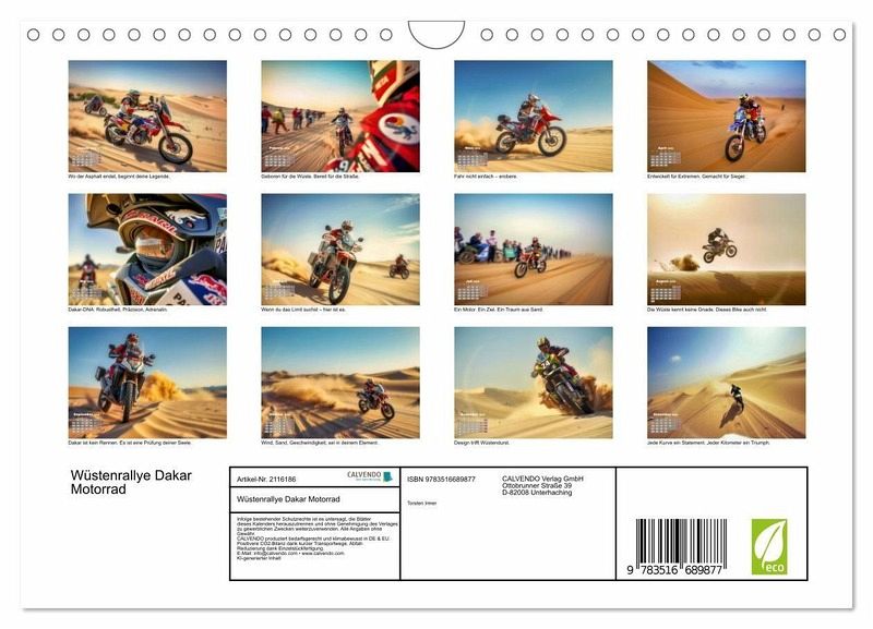 QUALITÄT - Hochwertiger Fotokalender mit 12 wunderschönen Motiven auf lichtbeständigem Bilderdruckpapier, robuste Spiralbindung mit Aufhängebügel.NACHHALTIG - deutliche Abfallreduzierung durch bedarfsgerechte Einzelstückfertigung, umweltfreundliches FSC-zertifiziertes Papier, Produktion in Deutschland, klimabewusste Logistik.PERFEKTES GESCHENK - Kalender für Freunde und Familie, für Kinder und Erwachsene, jung und alt, zu Weihnachten, Geburtstag oder zwischendurch.VIELFALT - Bildkalender in verschiedenen Formaten, z.B. DIN A5, DIN A4, DIN A3 sowie DIN A2. Ob Naturmotiv, Gemälde oder Fotos, ideal für ein persönliches Wohlfühlambiente.Jeder Motorenschlag ein Echo der Sahara. Dakar ist kein Ziel - es ist ein Lebensgefühl. von Autor(in): Torsten Irmer