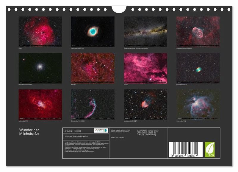 QUALITÄT - Hochwertiger Fotokalender mit 12 wunderschönen Motiven auf lichtbeständigem Bilderdruckpapier, robuste Spiralbindung mit Aufhängebügel.NACHHALTIG - deutliche Abfallreduzierung durch bedarfsgerechte Einzelstückfertigung, umweltfreundliches FSC-zertifiziertes Papier, Produktion in Deutschland, klimabewusste Logistik.PERFEKTES GESCHENK - Kalender für Freunde und Familie, für Kinder und Erwachsene, jung und alt, zu Weihnachten, Geburtstag oder zwischendurch.VIELFALT - Bildkalender in verschiedenen Formaten, z.B. DIN A5, DIN A4, DIN A3 sowie DIN A2. Ob Naturmotiv, Gemälde oder Fotos, ideal für ein persönliches Wohlfühlambiente.Farbenfrohe Nebel in unserer Heimatgalaxie von Autor(in): Markus A. R. Langlotz