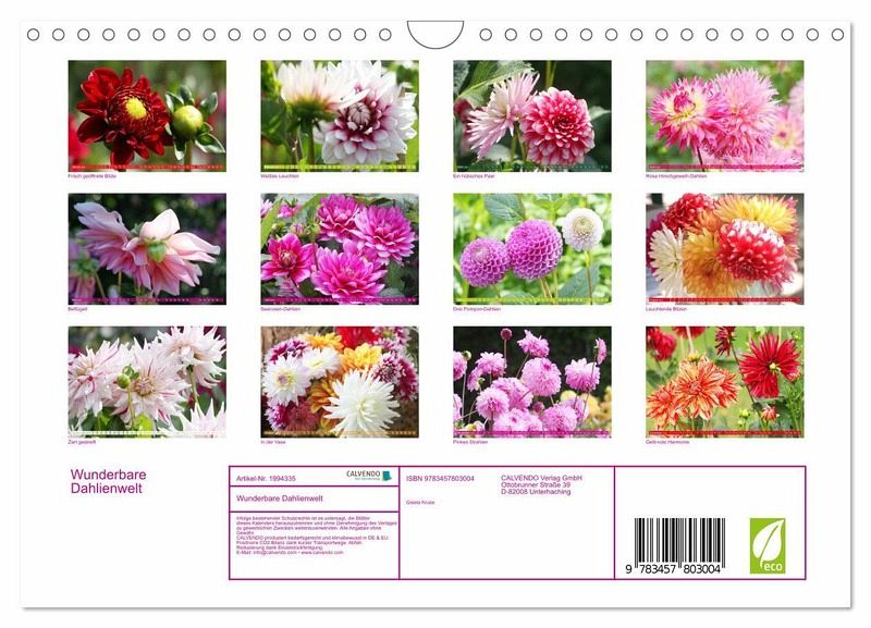 Genießen Sie die Dahlienwelt der Fotografin! Ihre Begeisterung für die Dahlie hat sie schon in 5 weiteren, auch englischsprachigen, Kalendern zum Ausdruck gebracht - und mehr ist noch in Arbeit. Dahlien von ihrer schönsten Seite finden Sie auf jeden Fall auch in diesem bunten Kalender.