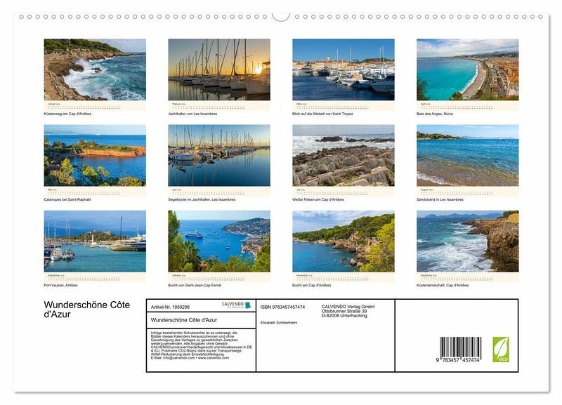 PREMIUM-LINIE - Brillanter Fotokalender mit 12 wunderschönen Motiven, Kunstdruck in Hochglanz in Museumsqualität.QUALITÄT - edle Materialien, stabile Rückwand mit 2 innovativen Einstecktaschen für eine optimale Präsentation an der Wand.NACHHALTIG - deutliche Abfallreduzierung durch bedarfsgerechte Einzelstückfertigung, umweltfreundliches FSC-zertifiziertes Papier, Produktion in Deutschland, klimabewusste Logistik.PERFEKTES GESCHENK - Kalender für Freunde und Familie, für Kinder und Erwachsene, jung und alt, zu Weihnachten, Geburtstag oder zwischendurch.Entdecken Sie die Traumlandschaften an der Côte d'Azur von Autor(in): Elisabeth Schittenhelm