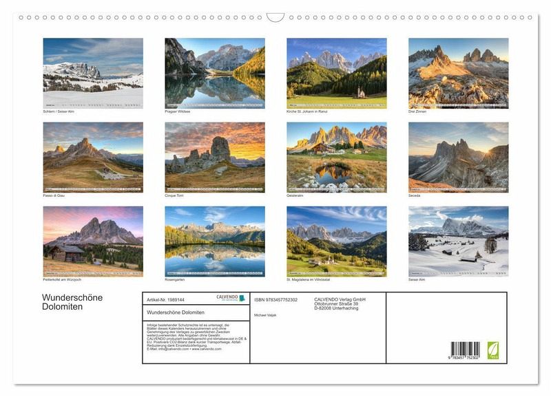 Erleben Sie die Schönheit und Einzigartigkeit der Dolomiten mit zwölf Bildern beliebter Sehenswürdigkeiten, die bei keinem Besuch fehlen sollten. Für diesen Kalender hat Michael Valjak zwölf seiner besten Aufnahmen zusammengestellt, die den Dolomitenliebhaber und alle, die sich für diese einzigartige Berglandschaft begeistern, durch das Jahr begleiten.