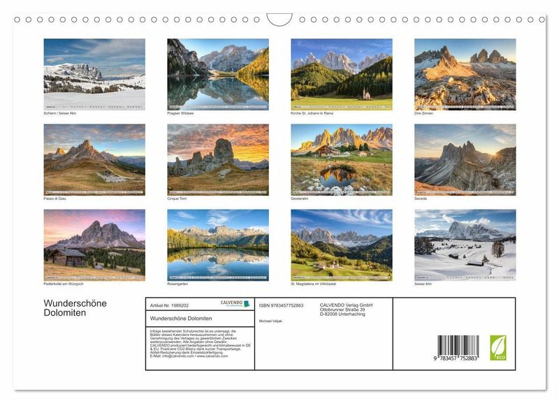 Erleben Sie die Schönheit und Einzigartigkeit der Dolomiten mit zwölf Bildern beliebter Sehenswürdigkeiten, die bei keinem Besuch fehlen sollten. Für diesen Kalender hat Michael Valjak zwölf seiner besten Aufnahmen zusammengestellt, die den Dolomitenliebhaber und alle, die sich für diese einzigartige Berglandschaft begeistern, durch das Jahr begleiten.