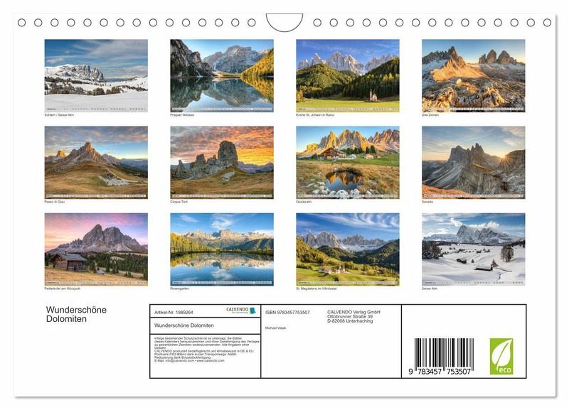 Erleben Sie die Schönheit und Einzigartigkeit der Dolomiten mit zwölf Bildern beliebter Sehenswürdigkeiten, die bei keinem Besuch fehlen sollten. Für diesen Kalender hat Michael Valjak zwölf seiner besten Aufnahmen zusammengestellt, die den Dolomitenliebhaber und alle, die sich für diese einzigartige Berglandschaft begeistern, durch das Jahr begleiten.