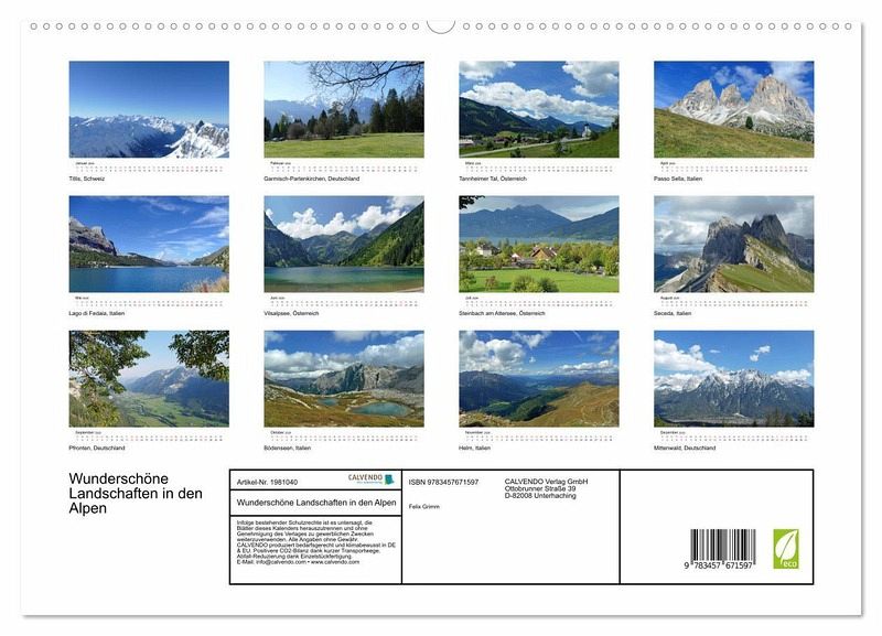 PREMIUM-LINIE - Brillanter Fotokalender mit 12 wunderschönen Motiven, Kunstdruck in Hochglanz in Museumsqualität.QUALITÄT - edle Materialien, stabile Rückwand mit 2 innovativen Einstecktaschen für eine optimale Präsentation an der Wand.NACHHALTIG - deutliche Abfallreduzierung durch bedarfsgerechte Einzelstückfertigung, umweltfreundliches FSC-zertifiziertes Papier, Produktion in Deutschland, klimabewusste Logistik.PERFEKTES GESCHENK - Kalender für Freunde und Familie, für Kinder und Erwachsene, jung und alt, zu Weihnachten, Geburtstag oder zwischendurch.In diesem Kalender gibt es schöne Fotos aus den Alpen zu sehen von Autor(in): Felix Grimm