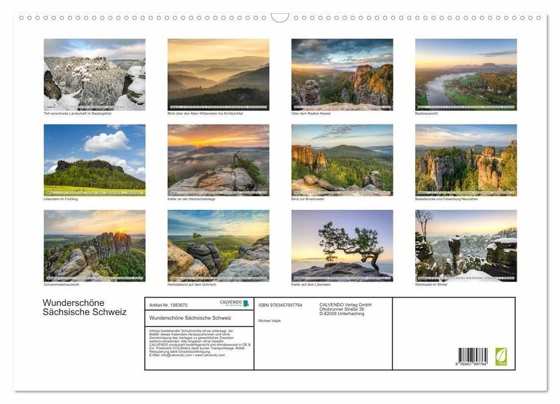 Einzigartige Felslandschaften, atemberaubende Aussichten und eine wunderschöne Landschaft zeichnen die Sächsische Schweiz aus. Für diesen Kalender hat Michael Valjak zwölf beeindruckende Aufnahmen dieser unvergleichlichen Landschaft zusammengestellt, die Sie durch das Jahr begleiten.