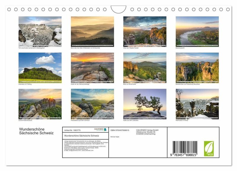 Einzigartige Felslandschaften, atemberaubende Aussichten und eine wunderschöne Landschaft zeichnen die Sächsische Schweiz aus. Für diesen Kalender hat Michael Valjak zwölf beeindruckende Aufnahmen dieser unvergleichlichen Landschaft zusammengestellt, die Sie durch das Jahr begleiten.