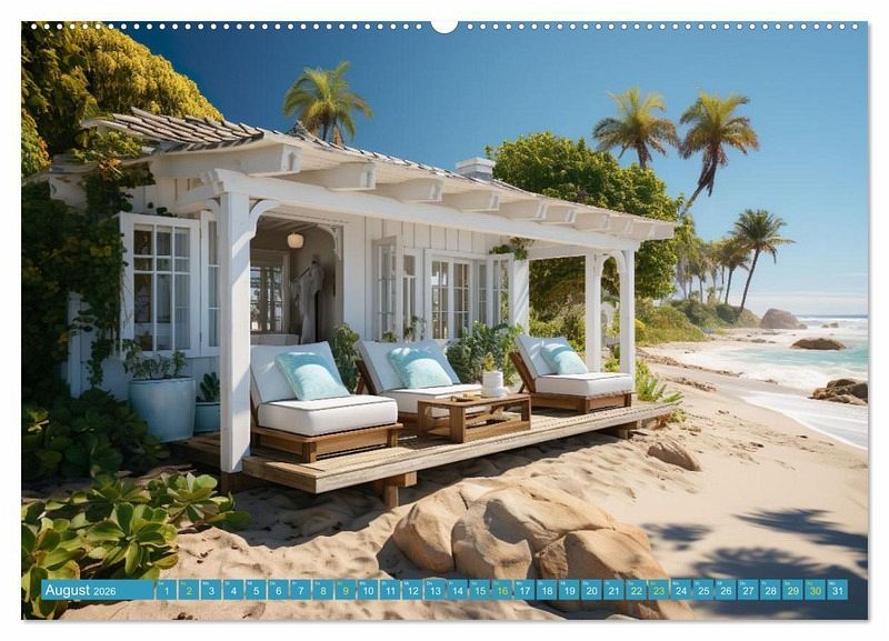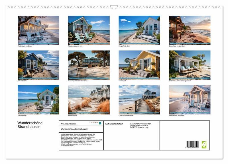 Erleben Sie Monat für Monat die unvergleichliche Schönheit atemberaubender Strandhäuser, eingebettet in malerischen Kulissen entlang der Küstenlinien. Von versteckten Rückzugsorten mit privaten Stegen bis hin zu luxuriösen Villen mit Panoramablick auf das türkisfarbene Meer bietet dieser Kalender eine Vielfalt von Strandhäusern, die das Herz höherschlagen lassen.Lassen Sie sich vom Charme dieser traumhaften Orte verzaubern. Dieser Kalender bietet eine Sammlung von Bildern, die die Sehnsucht nach Sonne, Sand und Meer wecken. Die strahlend blauen Gewässer, der sanfte Meereswind und der goldene Sand werden in jedem Foto lebendig.Dieser Strandhaus-Kalender ist nicht nur eine visuelle Freude, sondern auch eine Quelle der Inspiration. Träumen Sie von entspannten Tagen am Meer, spüren Sie die Entspannung, die diese Orte ausstrahlen, und lassen Sie den Stress des Alltags hinter sich. Ob in Ihrem Zuhause oder Büro, dieser Kalender wird Sie Monat für Monat in einen Kurzurlaub entführen. Obals Geschenk für Ihre Lieben oder als Inspirationsquelle für Ihr eigenes Zuhause, dieser Kalender ist ein zeitloses Kunstwerk, das Ästhetik und Funktionalität vereint.Bringen Sie die Schönheit der Strände in Ihr Zuhause oder Büro und lassen Sie sich von der Magie der Strandhäuser verführen. Tauchen Sie ein, entspannen Sie sich und träumen Sie von einem Leben am Meer.Die Bilder dieses Kalenders wurden mit Hilfe von künstlicher Intelligenz erstellt.