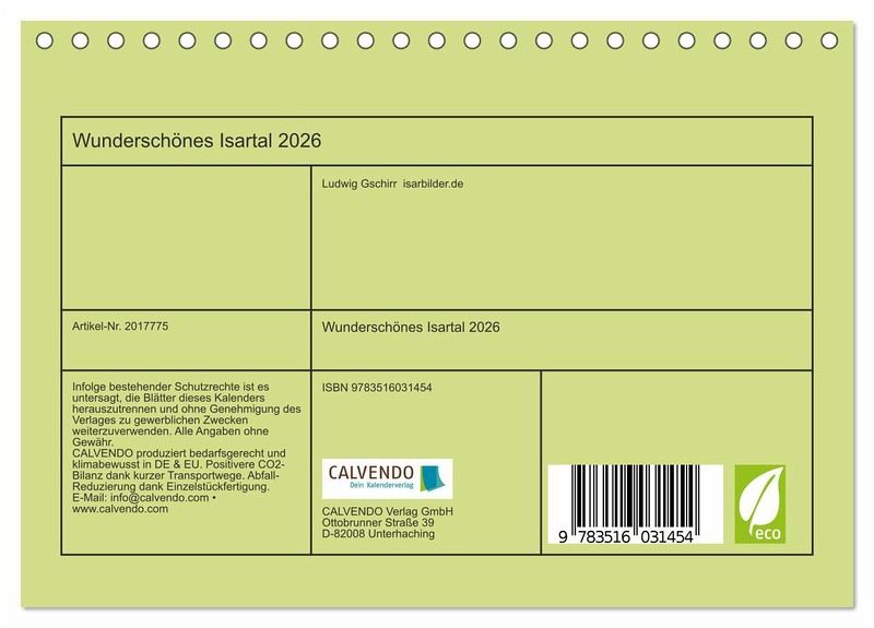 QUALITÄT - Hochwertiger Fotokalender mit 12 wunderschönen Motiven auf lichtbeständigem Bilderdruckpapier, robuste Spiralbindung.NACHHALTIG - deutliche Abfallreduzierung durch bedarfsgerechte Einzelstückfertigung, umweltfreundliches FSC-zertifiziertes Papier, Produktion in Deutschland, klimabewusste Logistik.PERFEKTES GESCHENK - Kalender für Freunde und Familie, für Kinder und Erwachsene, jung und alt, zu Weihnachten, Geburtstag oder zwischendurch.VIELFALT - Bildkalender in verschiedenen Formaten, z.B. DIN A5, DIN A4, DIN A3 sowie DIN A2. Ob Naturmotiv, Gemälde oder Fotos, ideal für ein persönliches Wohlfühlambiente.Bilder aus dem Isartal von Autor(in): Ludwig Gschirr