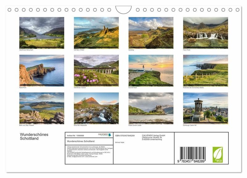 Erleben Sie die Schönheit und Einzigartigkeit der schottischen Landschaft mit zwölf Bildern beliebter Sehenswürdigkeiten, die bei keinem Besuch fehlen sollten. Für diesen Kalender hat Michael Valjak zwölf seiner besten Aufnahmen zusammengestellt, die den Schottlandfan und alle die sich für die schottische Natur und Landschaft begeistern durch das Jahr begleiten.