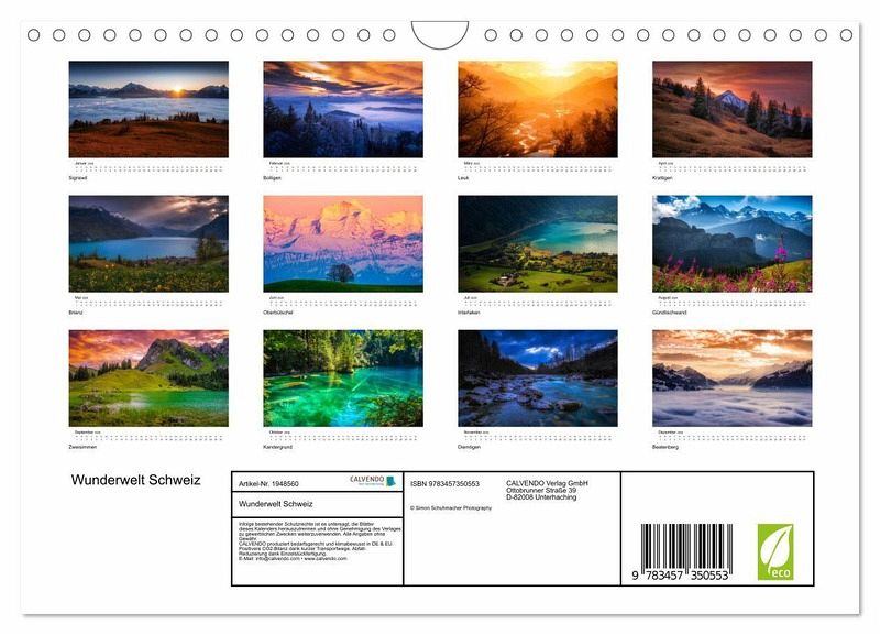 QUALITÄT - Hochwertiger Fotokalender mit 12 wunderschönen Motiven auf lichtbeständigem Bilderdruckpapier, robuste Spiralbindung mit Aufhängebügel.NACHHALTIG - deutliche Abfallreduzierung durch bedarfsgerechte Einzelstückfertigung, umweltfreundliches FSC-zertifiziertes Papier, Produktion in Deutschland, klimabewusste Logistik.PERFEKTES GESCHENK - Kalender für Freunde und Familie, für Kinder und Erwachsene, jung und alt, zu Weihnachten, Geburtstag oder zwischendurch.VIELFALT - Bildkalender in verschiedenen Formaten, z.B. DIN A5, DIN A4, DIN A3 sowie DIN A2. Ob Naturmotiv, Gemälde oder Fotos, ideal für ein persönliches Wohlfühlambiente.Landschaftsfotokalender mit den schönsten und beeindruckendsten Wunderlandschaften der Schweiz. von Autor(in): Simon Schuhmacher