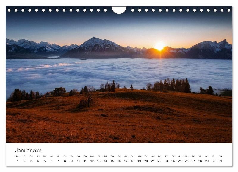 Geniessen Sie 12 Monate lang beeindruckende Aufnahmen, welche Ihnen die Wunder der Schweizer Natur in Ihrer ganzen Pracht nach Hause bringen. Erleben Sie mit diesem sorgfältig erstellten Fotokalender, mit seinen 12 prächtigen Fotografien, die traumhaften Momente, Atmosphären, Stimmungen, Naturschauspiele, Wetterphänomene, Jahreszeiten aus denselben Perspektiven wie ich sie als Landschaftsfotograf bei der Aufnahme in der wunderbaren Schöpfung erlebt habe. Jedes Bild ist absolut einzigartig und erzählt seine ganz eigene Geschichte.