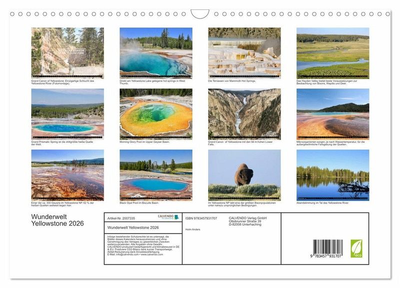 QUALITÄT - Hochwertiger Fotokalender mit 12 wunderschönen Motiven auf lichtbeständigem Bilderdruckpapier, robuste Spiralbindung mit Aufhängebügel.NACHHALTIG - deutliche Abfallreduzierung durch bedarfsgerechte Einzelstückfertigung, umweltfreundliches FSC-zertifiziertes Papier, Produktion in Deutschland, klimabewusste Logistik.PERFEKTES GESCHENK - Kalender für Freunde und Familie, für Kinder und Erwachsene, jung und alt, zu Weihnachten, Geburtstag oder zwischendurch.VIELFALT - Bildkalender in verschiedenen Formaten, z.B. DIN A5, DIN A4, DIN A3 sowie DIN A2. Ob Naturmotiv, Gemälde oder Fotos, ideal für ein persönliches Wohlfühlambiente.Der Yellowstone Nationalpark bietet eine einzigartige geologische Ansammlung von heißen Quellen und Geysiren. Die durch Mikroorganismen gebildeten Farben und Formen begründen eine Wunderwelt der Natur. von Autor(in): Holm Anders