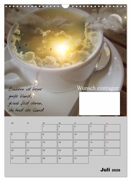 Dieser Planer macht wirklich Freude. In jedem Monat ist ein Kästchen, Sie können dort direkt Ihren persönlichen Wunsch eintragen und mit einem Zauberspruch auf die Reise in das Universum schicken. Jeder Monat ist bereits mit einem schönen Zauberspruch versehen, der Ihren persönlichen Wünschen Kraft verleiht. Ein zauberhafter Planer für den täglichen Hokuspokus. Mit einem Augenzwinkern erstellt, aber dennoch kraftvoll und wirksam.