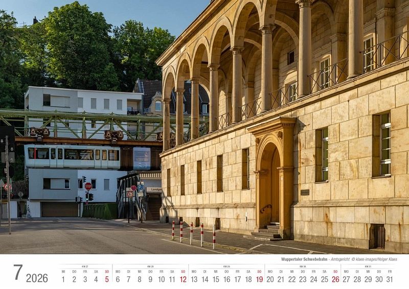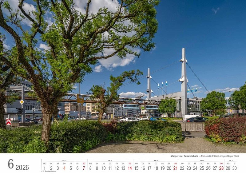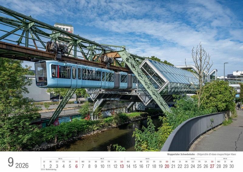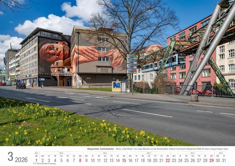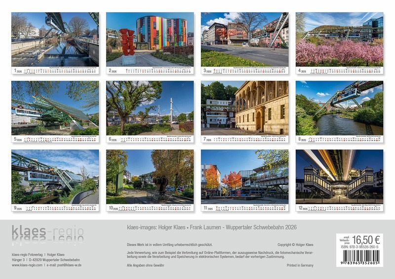 Der hochwertig verarbeitete Bildkalender Wuppertaler Schwebebahn 2026 zeigt mit aktuellen, stimmungsvollen und repräsentativen Aufnahmen das einzigartige Verkehrsmittel auf Ihrer Fahrt durch die Bergische Metropole. Umfangreiches Kalendarium mit deutschen Fest- und Feiertagen, Mondphasen, Sommer-/Winteranfang kalendarisch und meteorologisch. 14 Seiten, Bilderdruck matt 170 g + stabiler Graukarton aus 1 mm Buchbinderpappe als Rückwand vor dem Indexblatt. Format A3, ca. 42 x 30 cm quer, Spiralbindung.