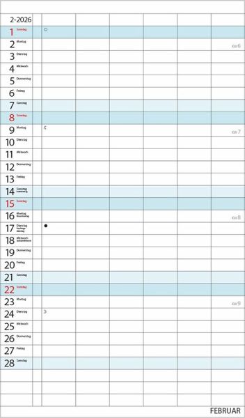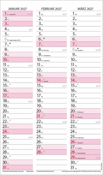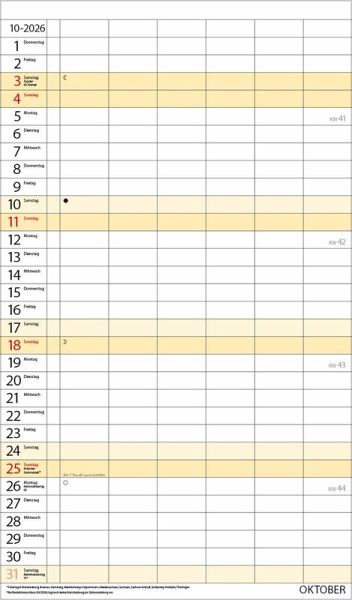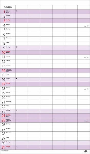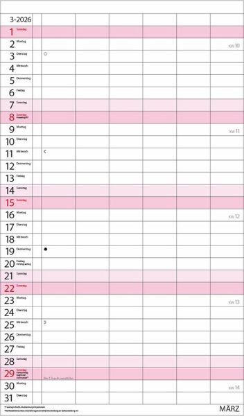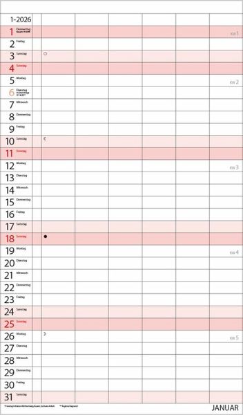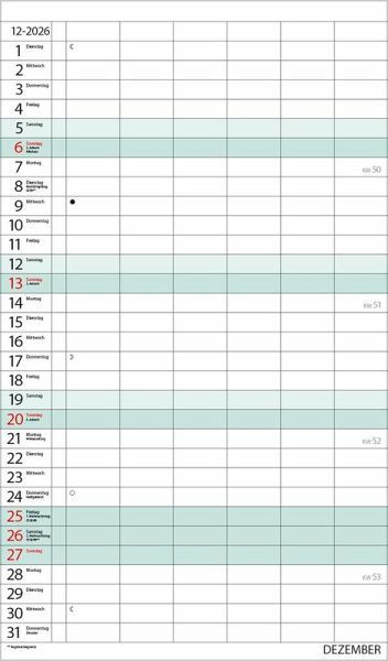 Übersichtlicher Familienplaner mit 6 großen Spalten; sehr stabile Rückwand; 27 x 46 cm Praktische Zusatzspalte für Ferien, Müll und weitere AktivitätenTerminkalender mit viel Platz für Eintragungen, ohne störende Bilder in den Spalten leichte Beschreibbarkeit, auch mit Bunt- und Bleistiften Deutsches Kalendarium mit regionalen Feiertagen für Deutschland, Österreich und Schweiz Farblich hervorgehobene Sonn- und Feiertage, sowie Anzeige der Zeitumstellung Gedruckt auf dickem und umweltfreundlichem FSC Papier