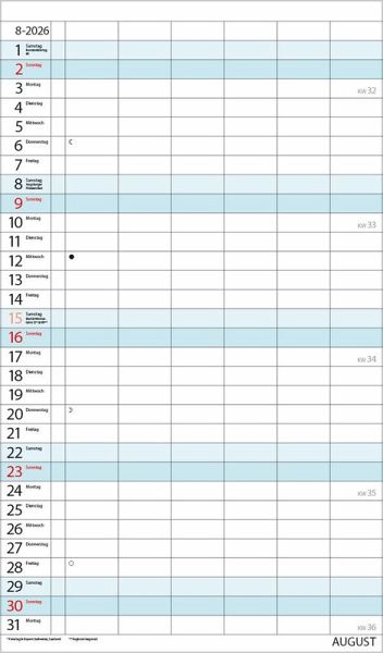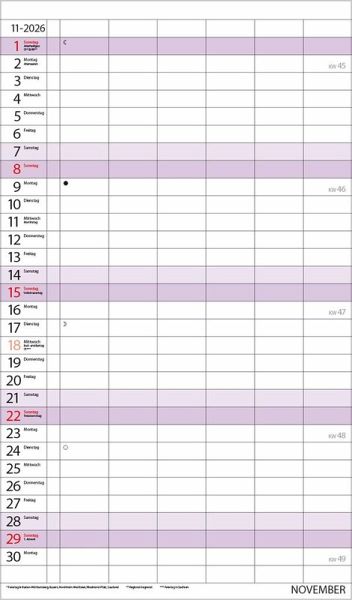 Weitere Informationen wie Mondphasen, Ferientermine und Feiertage (auch regionale) sowie deutlich lesbare Kalenderwochen runden den Kalender ab und sorgen für einen vollständigen Überblick Ihres Jahres.