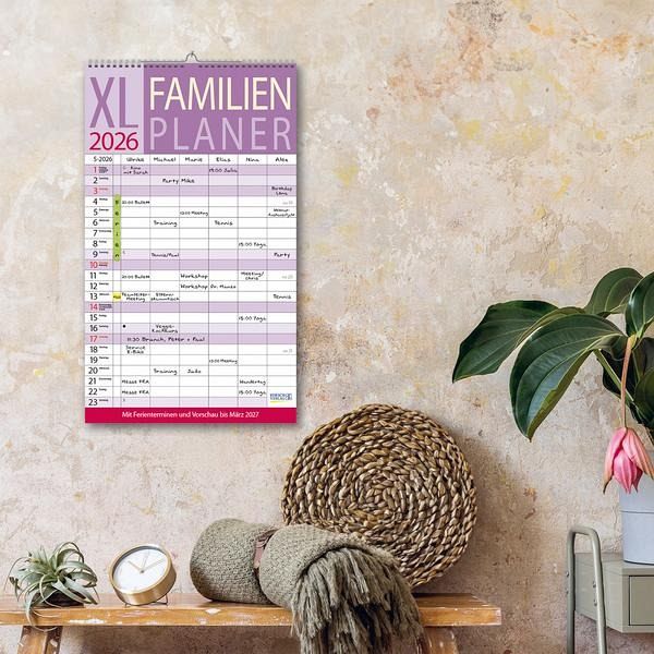 Mit sechs Spalten zum Eintragen von Geburtstagen, Terminen und Erinnerungen bietet der Familienkalender XL viel Platz für Notizen. Damit ist es auch möglich mehrere Termine in einen Tag zu schreiben. Der Organisation des Alltags von großen und kleinen Familien steht somit nix mehr im Weg. Neben dem gesamten Kalenderjahr enthält der Wandplaner auch eine Vorschau bis März des Folgejahres.