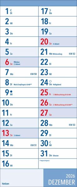 XL-Wandkalender mit extra großer Schrift und modernen Farben. Inklusive Ferienterminen und Vorschau bis März des Folgejahres. Kalendarium in Deutsch.