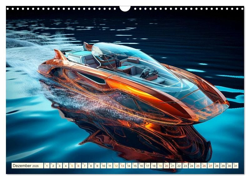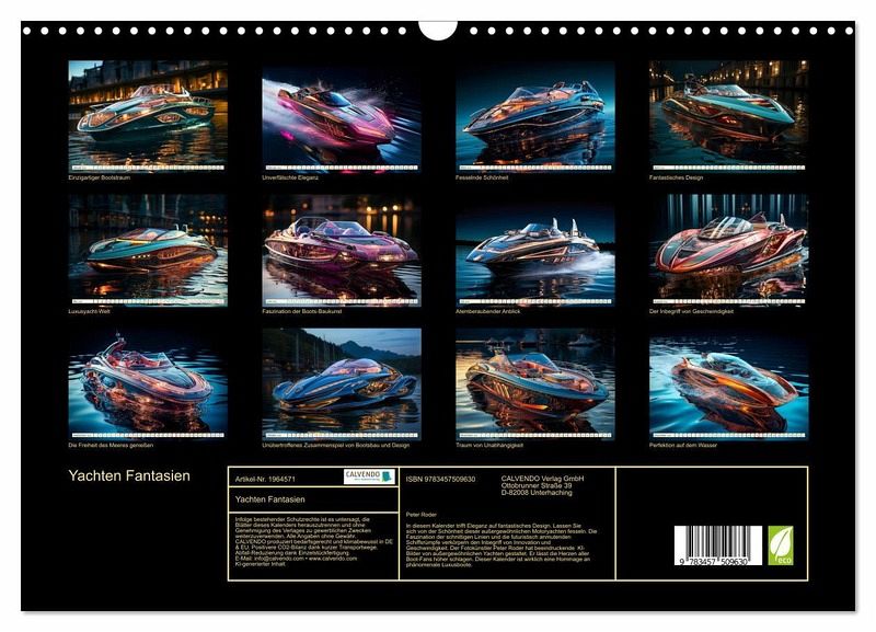 In diesem Kalender trifft Eleganz auf fantastisches Design. Lassen Sie sich von der Schönheit dieser außergewöhnlichen Motoryachten fesseln. Die Faszination der schnittigen Linien und die futuristisch anmutenden Schiffsrümpfe verkörpern den Inbegriff von Innovation und Geschwindigkeit. Der Fotokünstler Peter Roder hat beeindruckende KI-Bilder von außergewöhnlichen Yachten gestaltet. Er lässt die Herzen aller Boot-Fans höher schlagen. Dieser Kalender ist wirklich eine Hommage an phänomenale Luxusboote.