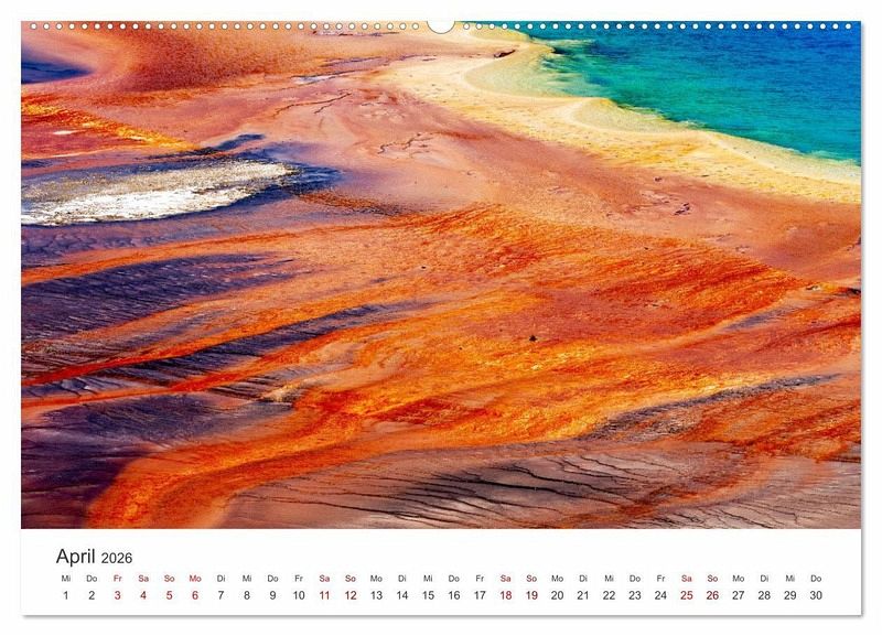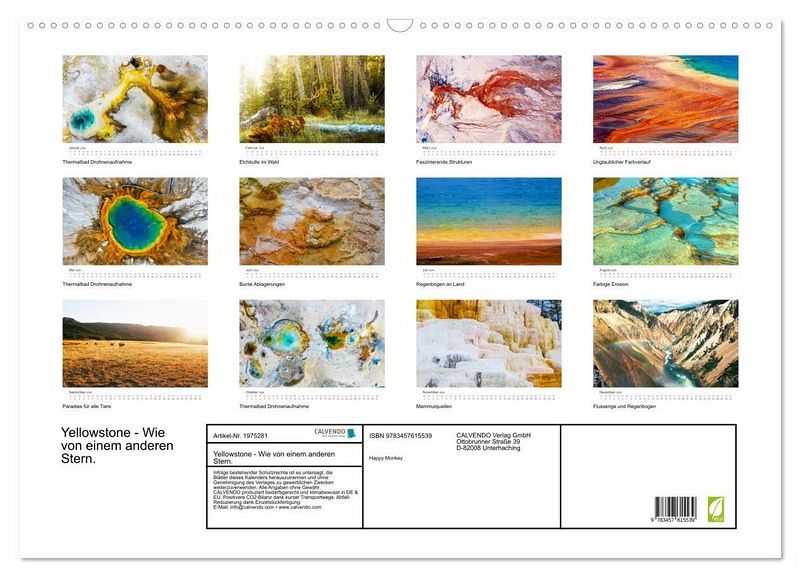 Der Yellowstone Nationalpark scheint nicht von dieser Welt zu sein. Mit seinen spektakulären Thermalbädern und Landschaften ist er das perfekte Motiv für einen Fotografen. Mit diesem Kalender werden Sie Bilder bestaunen, die Sie nie zuvor gesehen haben. Jeden Monat aufs Neue können Sie sich von der unglaublichen Schönheit des Yellowstone Nationalparks hinreißen lassen.