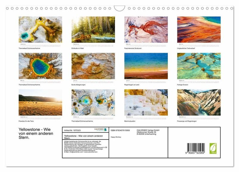 Der Yellowstone Nationalpark scheint nicht von dieser Welt zu sein. Mit seinen spektakulären Thermalbädern und Landschaften ist er das perfekte Motiv für einen Fotografen. Mit diesem Kalender werden Sie Bilder bestaunen, die Sie nie zuvor gesehen haben. Jeden Monat aufs Neue können Sie sich von der unglaublichen Schönheit des Yellowstone Nationalparks hinreißen lassen.