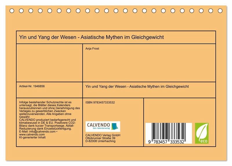 QUALITÄT - Hochwertiger Fotokalender mit 12 wunderschönen Motiven auf lichtbeständigem Bilderdruckpapier, robuste Spiralbindung.NACHHALTIG - deutliche Abfallreduzierung durch bedarfsgerechte Einzelstückfertigung, umweltfreundliches FSC-zertifiziertes Papier, Produktion in Deutschland, klimabewusste Logistik.PERFEKTES GESCHENK - Kalender für Freunde und Familie, für Kinder und Erwachsene, jung und alt, zu Weihnachten, Geburtstag oder zwischendurch.VIELFALT - Bildkalender in verschiedenen Formaten, z.B. DIN A5, DIN A4, DIN A3 sowie DIN A2. Ob Naturmotiv, Gemälde oder Fotos, ideal für ein persönliches Wohlfühlambiente.Legenden der Harmonie - Asiatische Wesen im Gleichgewicht des Yin und Yang von Autor(in): Anja Frost
