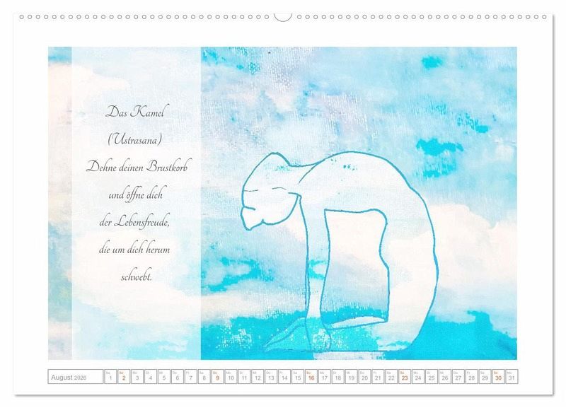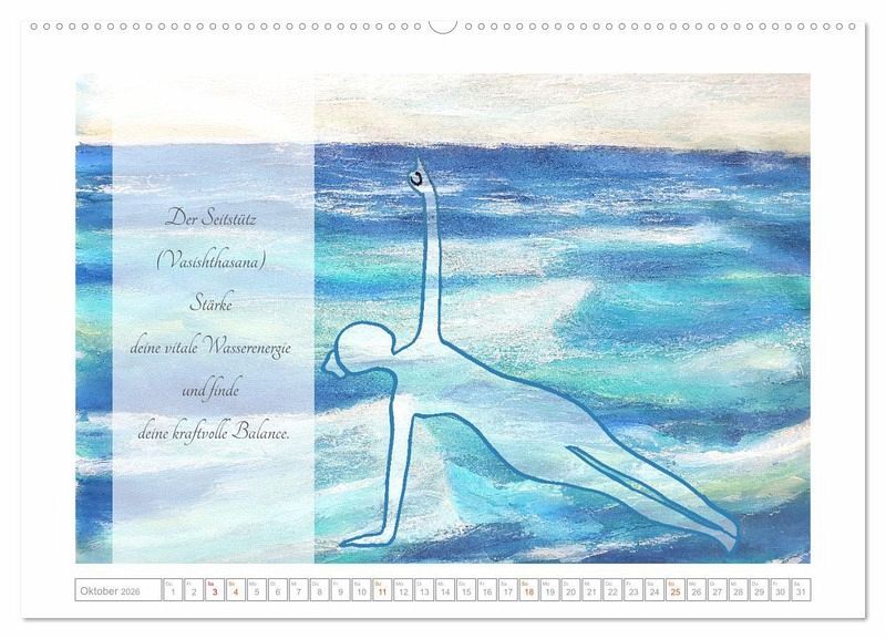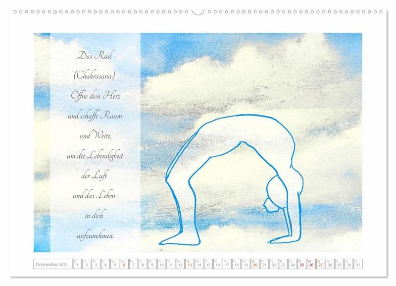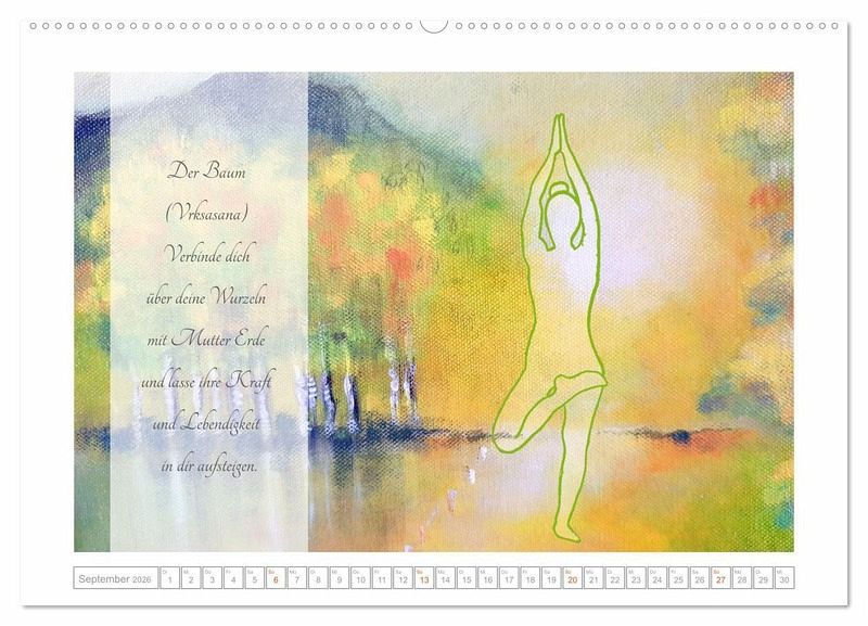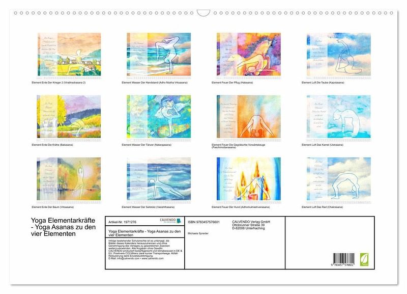 Die Elementarkräfte in Erde, Feuer, Wasser und Luft können in gezielten Yoga Asanas erlebt und zu eigenen Stärken entwickelt werden. Der Kalender präsentiert zwölf Asanas zu den vier Elementen, die auf einem bezaubernden Hintergrund aus künstlerischen Bildern abgebildet sind. Begleitet werden die Yogaübungen durch Texte zur jeweiligen Asana und dem dazu passenden Element.