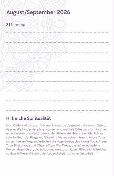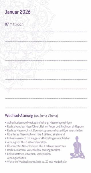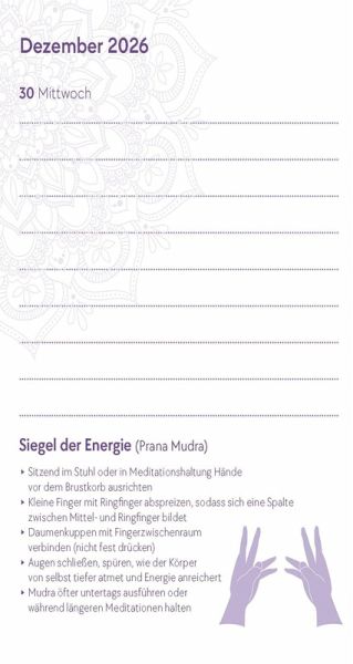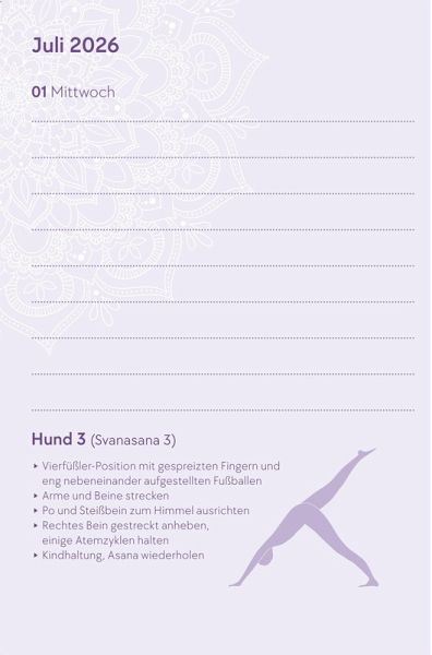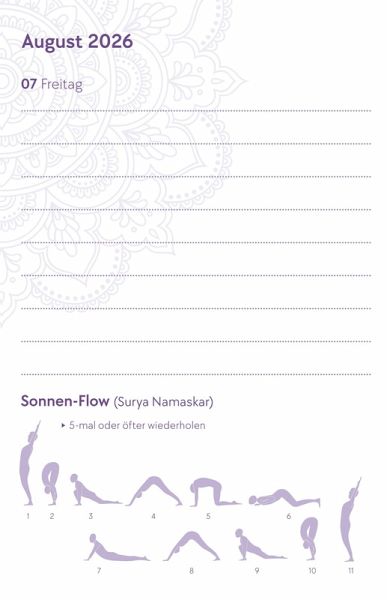 Der Yoga-Wochenkalender 2026 ist eine Quelle der Inspiration und des inneren Wachstums. Jede Woche bietet eine Kombination aus Yoga-Philosophie, Asana-Übungen, Meditationen und Affirmationen, um Körper, Geist und Seele in Einklang zu bringen. Lerne, im Hier und Jetzt zu leben, stärke deine Präsenz, finde zur Inneren Ruhe, jeden Tag ein Stück mehr. Vertiefe dein Verständnis für die philosophischen Prinzipien des Yoga und ihren praktischen Nutzen, finde zu mehr Ausgeglichenheit, indem du dich auf Gleichgewicht und Harmonie konzentrierst, und reflektiere über deine Woche und setze dir Ziele für deine persönliche Weiterentwicklung.