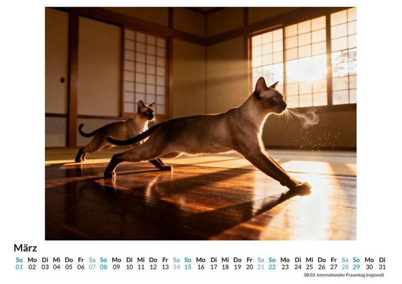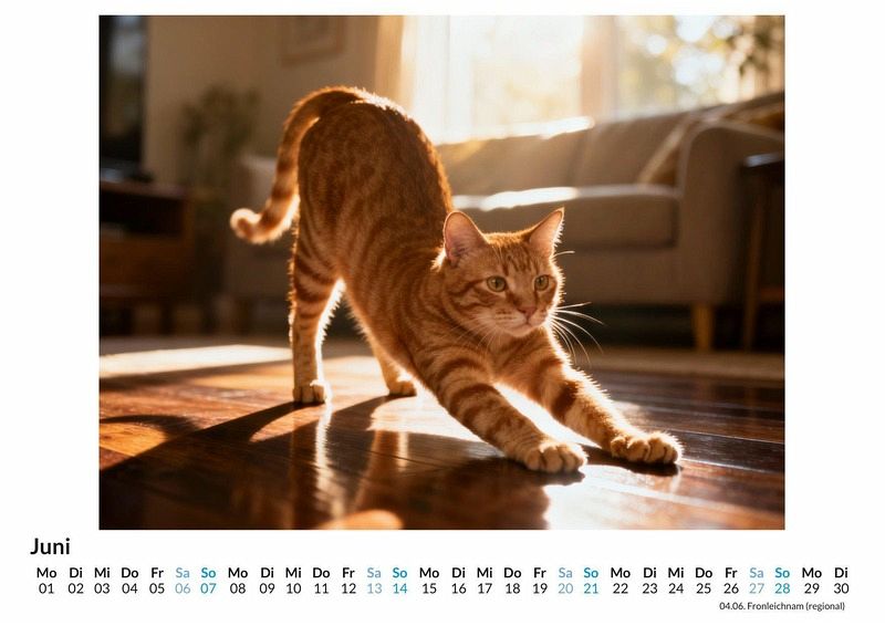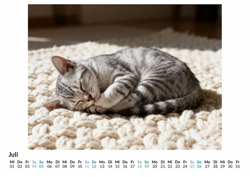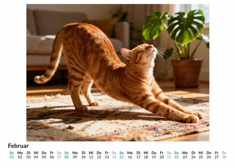 Einleitung Was, wenn die anmutigen Dehnübungen einer Katze mehr sind als nur Fellpflege? Der Kalender "Yoga-Katzen" fängt genau diese Momente ein. Er zeigt eine Fotostrecke, in der Samtpfoten Posen einnehmen, die menschlichen Yoga-Figuren verblüffend ähneln. Jeder Monat präsentiert eine neue, humorvolle Interpretation tierischer Gelenkigkeit, die aufzeigt, dass die wahren Meister der Entspannung auf vier Pfoten unterwegs sind. Auflistung in 3 Stichpunkten, für wen der Kalender optimal geeignet ist Für alle, die von der Eleganz und dem Charme von Katzen fasziniert sind. Für Menschen mit einer Leidenschaft für Yoga und Achtsamkeit. Für Suchende nach einem originellen und humorvollen Geschenk. Kurzer beschreibender Text Jedes Monatsblatt enthüllt eine neue Szene, von der "herabschauenden Katze" bis zum "Krieger auf vier Pfoten". Diese einzigartigen Bildkompositionen wurden durch das Zusammenspiel von kreativen Ideen und komplexen Rechenprozessen zum Leben erweckt. Die Fotografien zeigen die Tiere in Momenten der Ruhe und Konzentration, mal verspielt, mal fast meditativ. Die Verbindung von tierischer Anmut und bekannten Yoga-Haltungen schafft eine unterhaltsame und zugleich entspannende Atmosphäre für jeden Raum. Auflistung in 3 Stichpunkten, die übersichtlich und kurz wiedergibt, was der Kunde beim Kauf dieses Kalenders erwarten kann Zwölf Monatsmotive mit Katzen in yogaähnlichen Posen. Ein praktischer Wandkalender mit übersichtlichem Kalendarium. Eine tägliche Dosis Humor und Gelassenheit für das ganze Jahr. Zusammenfassung und motivierende Aufforderung zum Anschauen des Kalenders Der Kalender "Yoga-Katzen" verbindet die beruhigende Welt des Yoga mit dem liebenswerten Wesen von Katzen. Eine charmante Begleitung durch das Jahr, die immer wieder ein Lächeln hervorzaubert. Es lohnt sich, einen Blick auf die einzelnen Monatsblätter zu werfen und die Vielfalt der Posen zu entdecken.