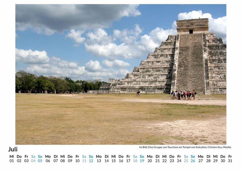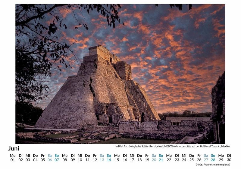 Entdecken Sie die faszinierende Schönheit der mexikanischen Halbinsel Yucatan mit unserem exklusiven Wandkalender! Lassen Sie sich Monat für Monat von atemberaubenden Motiven verzaubern - von den mystischen Maya-Ruinen bis hin zu den traumhaften Stränden und üppigen Dschungellandschaften. Jedes der 12 sorgfältig ausgewählten Bilder wird auf hochwertigem, lichtbeständigem Bilderdruckpapier präsentiert, das die Farben lebendig und strahlend hält. Gedruckt in Deutschland auf FSC-zertifiziertem Papier, vereint dieser Kalender Nachhaltigkeit und höchste Qualität. Holen Sie sich ein Stück Yucatan in Ihr Zuhause und lassen Sie sich das ganze Jahr über inspirieren! Hochwertig Erleben Sie ein Jahr voller Eleganz mit unserem Premium-Fotokalender. Jedes der 12 Motive ist auf hochwertigem, lichtbeständigem Bilderdruckpapier gedruckt, um die Lebendigkeit jedes Bildes zu bewahren. Die robuste Spiralbindung gewährleistet Langlebigkeit und einfache Handhabung. Nachhaltig Unser Engagement für die Umwelt spiegelt sich in jedem Exemplar wider. Durch die Produktion auf Abruf reduzieren wir signifikant unseren Abfall. Wir verwenden ausschließlich umweltfreundliches, FSC-zertifiziertes Papier. Stolz gefertigt in Deutschland, achten wir bei unserer Logistik auf Klimaschutz, um unseren ökologischen Fußabdruck zu minimieren. Das ideale Geschenk Dieser Kalender ist das perfekte Präsent für jeden Anlass - ob Weihnachten, Geburtstage oder einfach als liebevolle Aufmerksamkeit zwischendurch. Geeignet für Freunde, Familie, Kinder und Erwachsene gleichermaßen, bereichert er jedes Zuhause mit seiner Vielfalt und Schönheit, unabhängig vom Alter der Beschenkten.