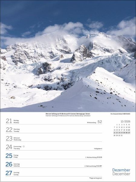 - Kalendarium auf Deutsch und Englisch mit hervorgehobenen Sonn- und Feiertagen für D, A und CH