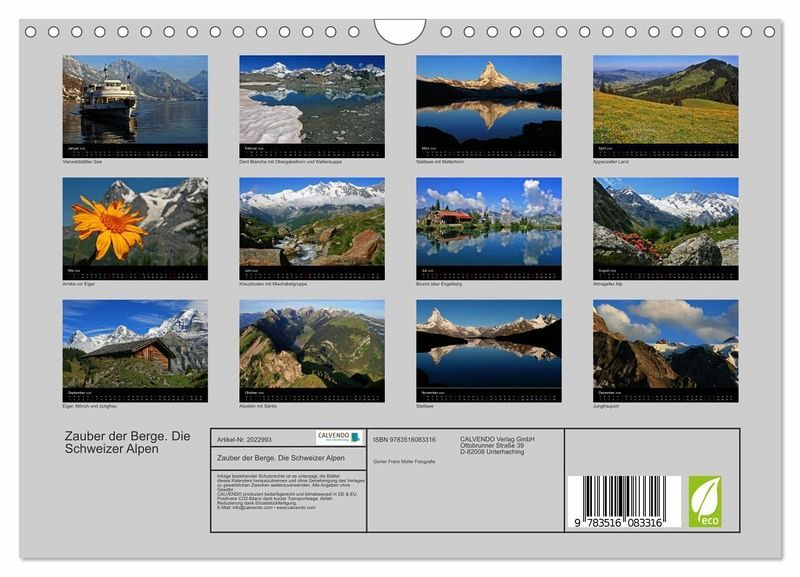 Die schönsten und höchsten Berge der Alpen geben sich in der Schweiz ein Stelldichein. Durch Wanderwege, Bahnen und Seilbahnen sind sie bestens erschlossen und denkbar leicht erreichbar. Immer wieder zieht es mich auf der Suche nach schönen Berg- und Naturmotiven dahin. Eine Auswahl der dabei entstandenen Fotos habe ich in diesem Kalender zusammengefasst.