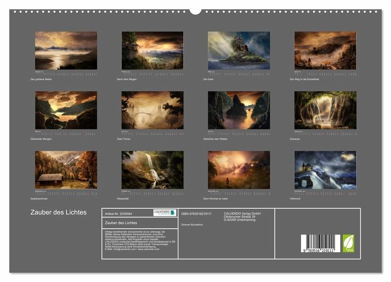 PREMIUM-LINIE - Brillanter Fotokalender mit 12 wunderschönen Motiven, Kunstdruck in Hochglanz in Museumsqualität.QUALITÄT - edle Materialien, stabile Rückwand mit 2 innovativen Einstecktaschen für eine optimale Präsentation an der Wand.NACHHALTIG - deutliche Abfallreduzierung durch bedarfsgerechte Einzelstückfertigung, umweltfreundliches FSC-zertifiziertes Papier, Produktion in Deutschland, klimabewusste Logistik.PERFEKTES GESCHENK - Kalender für Freunde und Familie, für Kinder und Erwachsene, jung und alt, zu Weihnachten, Geburtstag oder zwischendurch.Durch Licht verzauberte Fantasy - Landschaften - Composings der besonderen Art von Autor(in): Simone Wunderlich